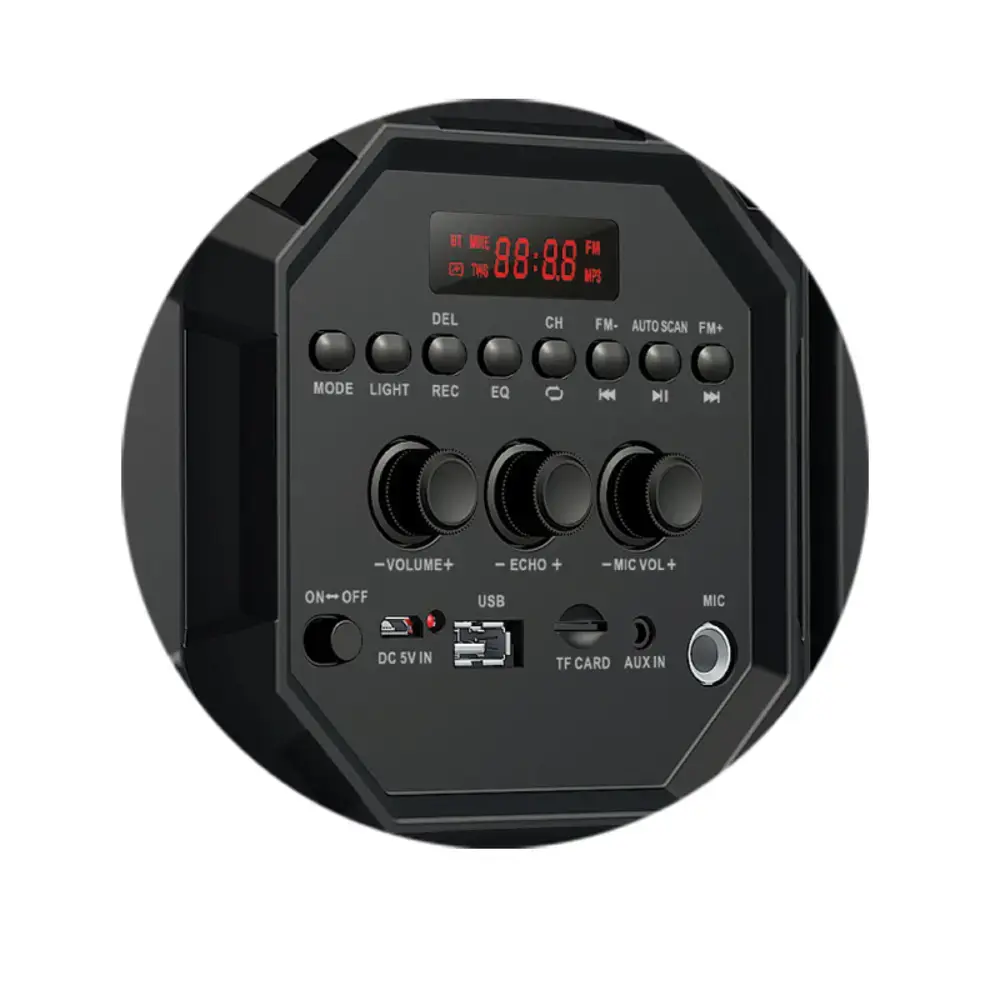 A portable bluetooth player controlled by a smartphone (bluetooth) or built-in buttons. A high quality D / A converter that allows you to restore lossless files. The loudspeaker has a bluetooth mode, FM radio, pendrive, microSD card, AUX, Microphone IN and telephone calls. 2 102mm mid-bass speakers + 2 tweeters 37mm provide exceptional sound quality. In addition, you can adjust bass and treble yourself (bass, treble). Multicolored RGB backlight in several modes, gives the device a unique design, but if you want, you can also turn it off.