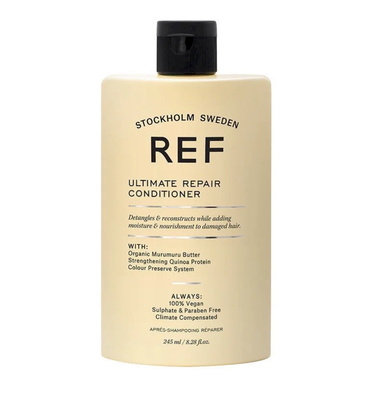 REF Ultimate Repair Conditioner 245ml on intensiivselt taastav juuksekonditsioon, mis on mõeldud kuivadele, kahjustunud ja keemiliselt töödeldud juustele, pakkudes sügavat niisutust, tugevdades ja juuksekihikute taastamist, jättes lokkid pehmemaks, elastikumaks ja läikivamaks; rikastatud taimsete ekstraktide, quinoaproteiinide, murumuruõli ja pantenooliga, aitab see valem võidelda kuivusega, parandada seiskumist, kaitsta juukseid purunemise, UV-kahjustuste ja kuumaks stylingu eest ning pideva kasutamisega tugevdab see juukseid juurest otsteni, ennetab juuksekahjustusi ja taastab sujuvuse ning terve, korrastatud välimuse
