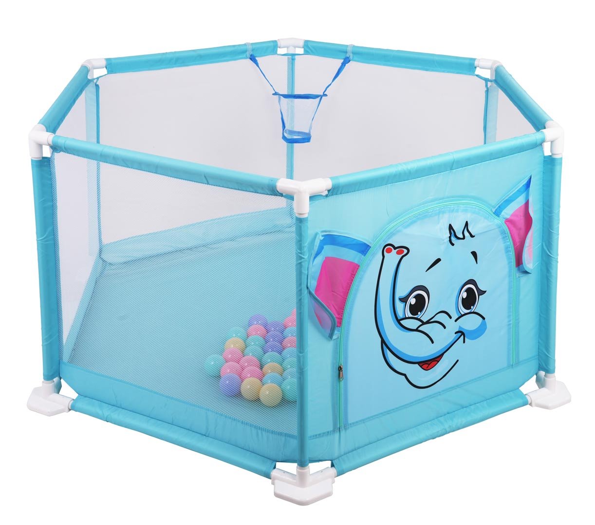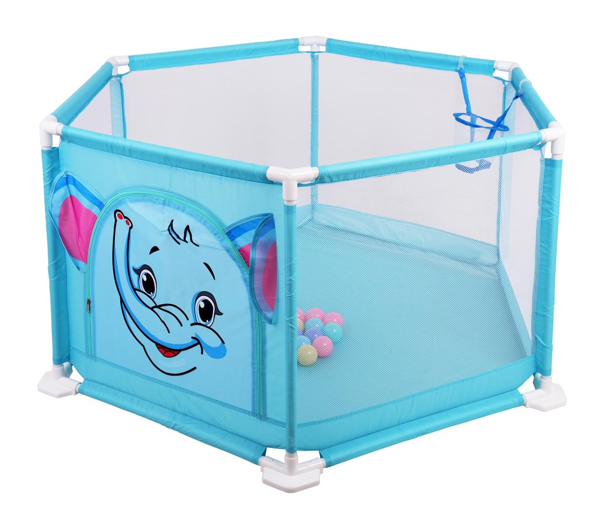 RoGer Elephant Baby Playpen With 50 Balls is a lightweight and safe play area designed for children to play indoors or outdoors. The hexagonal structure is made from durable fabric, mesh sides and plastic elements that provide stability and good ventilation. Mesh panels allow parents to easily watch the child while playing, while the zippered side entrance provides convenient access to the playpen. The set includes a basketball hoop and 50 lightweight plastic balls, allowing the playpen to be used as a ball pit and activity center that helps develop coordination, motor skills and physical activity. The structure is easy to assemble and disassemble without tools, convenient to transport and store, and the materials are easy to clean.
