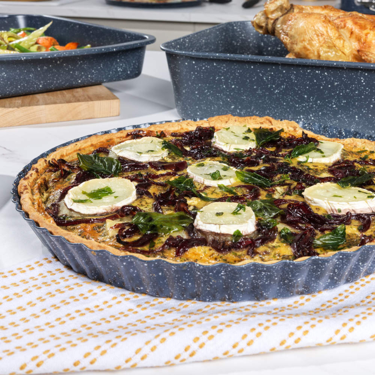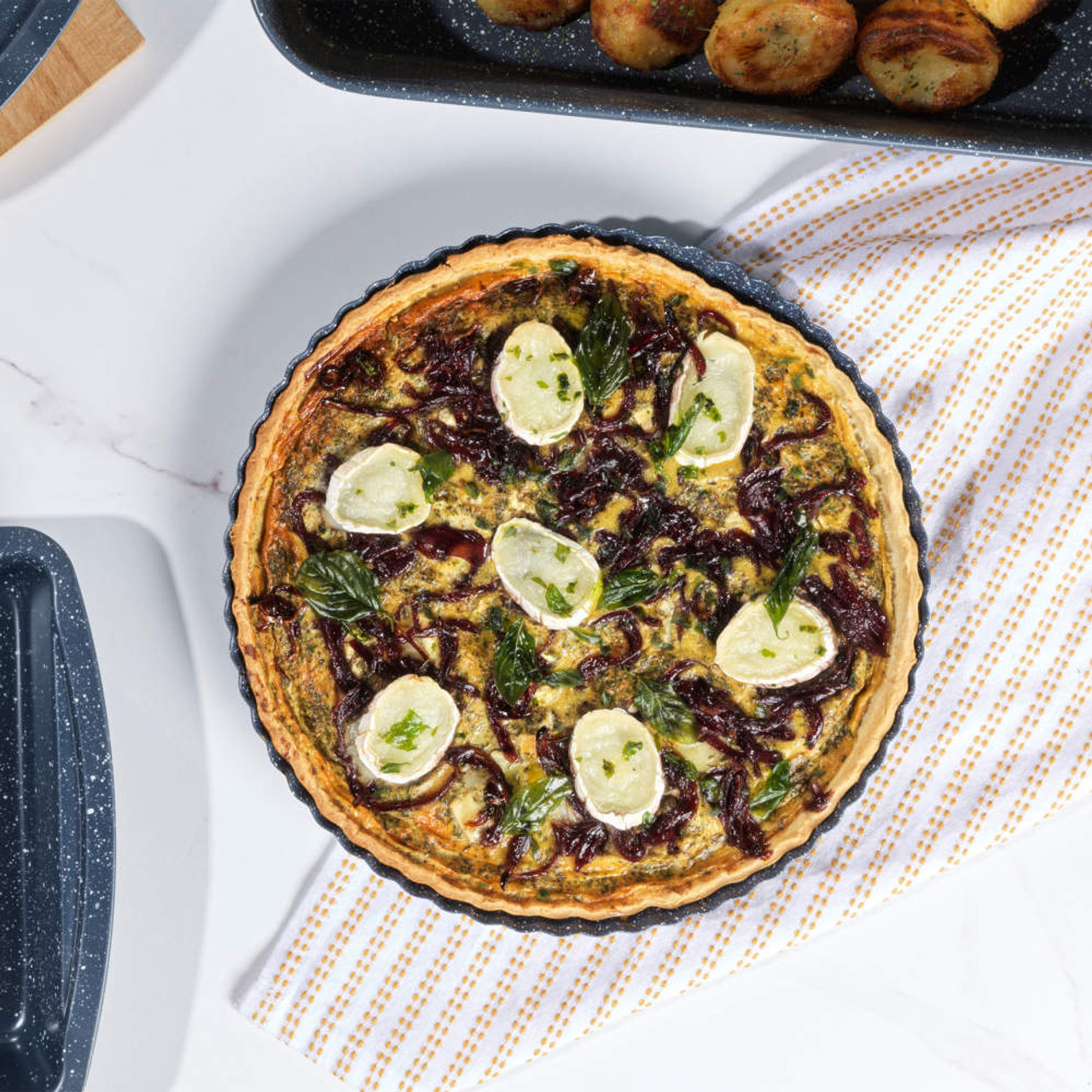 Perfect for cooking fresh pies, quiche and tarts, this Russell Hobbs Nightfall Stone 28 cm tart pan offers excellent baking performance. Cleaning has never been easier thanks to the non-stick coating,allowing you to easily remove your bakes without leaving residue. Crafted from lightweight carbon steel, this tin is an excellent heat conductor and will maintain its durability even with regular use. Perfect for regular baking, this round flan tin is oven safe up to 220 °C/gas mark 7 and heats quickly for even cooking results. Offering safety and reliability, this non-stick tin is PFOA-free to avoid releasing harmful chemicals into your food if overheated.