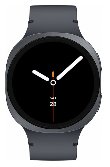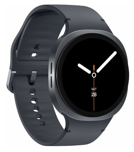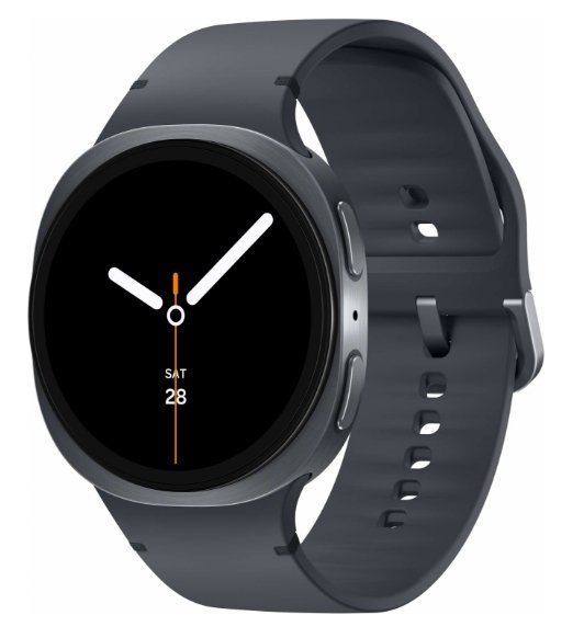 Samsung Galaxy Watch 8Display: 1.47" Super AMOLED, 480×480 px, Always-OnMaterial: Armor aluminumStrap: black sports, interchangeableProcessor: Exynos W1000Memory: 2 GB RAM, 32 GB internalConnectivity: Bluetooth 5.3, Wi-Fi 2.4/5 GHz, NFC, GPS, LTE (eSIM)OS: Wear OS 6 + One UI 8 WatchSensors: Heart, ECG, SpO2, temperature, gyroscopeWater resistance: IP68, 5 ATMBattery: 435 mAh, up to 30–40 hWeight: 34g