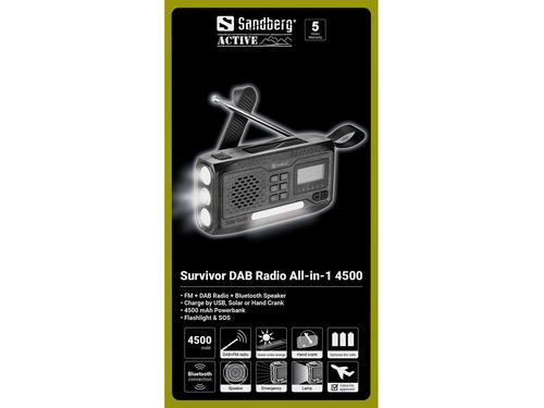 Sandberg Survivor DAB Radio All-in-1 4500 is a compact and durable device that combines multiple functions in one. Whether you're adventuring in the wild or facing an emergency, it has everything you need. It serves as a powerbank to charge your smartphone, a Bluetooth speaker for music streaming from your phone, and a radio with DAB and FM reception. With a built-in solar panel and hand crank, you can recharge when the power is out, and it also works with AAA batteries as an alternative. Additionally, it provides light as both a flashlight and a reading lamp. The Sandberg Survivor DAB Radio All-in-1 4500 is ready for any situation.Sandberg Survivor DAB Radio All-in-1 4500. Tuner type: Analog & digital, Supported radio bands: DAB+, FM, FM band range: 87.5 - 108 MHz. RMS rated power: 3 W. USB connector type: USB Type-A, USB Type-C. Product colour: Black, Coloration: Monochromatic, Volume control: Buttons. Battery capacity: 4500 mAh, Battery type: AAA, Battery voltage: 3.7 V
