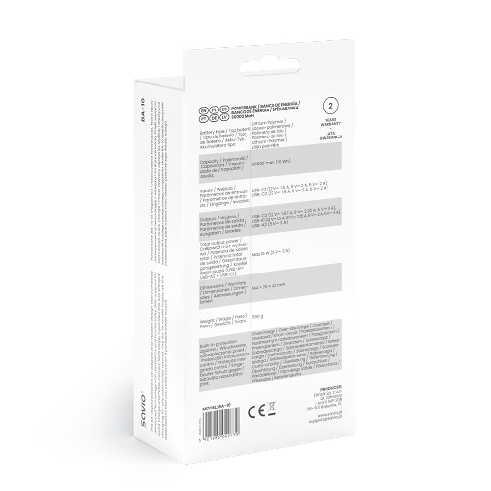 | Komplekti kuuluvad tarvikud | Powerbank SAVIO SAVIO BA-10 30000 mAh (111 Wh), Kabel USB-A USB-C 2 A 30 cm, Instrukcja obsługi |
