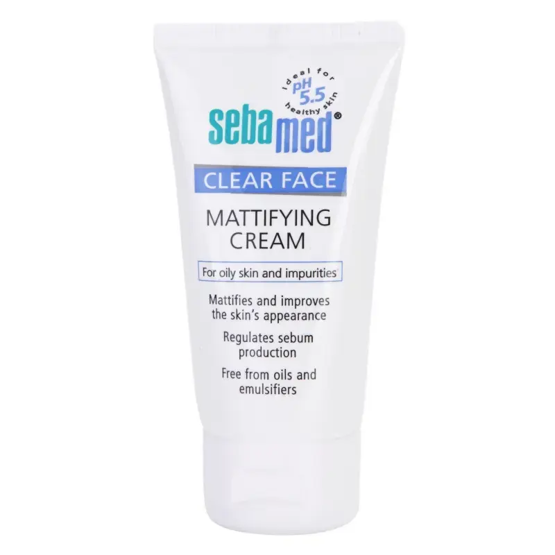 Sebamed Clear Face Mattifying Cream is specially formulated to control excess oil, reduce shine, and prevent breakouts in oily, acne-prone skin. With a skin friendly pH of 5.5, this lightweight, non-greasy formula supports your skin's natural protective barrier while helping to regulate oil production. Infused with a unique care complex featuring aloe vera, hyaluronic acid, and horse chestnut extract, it hydrates, soothes irritation, and promotes a balanced complexion. Benefits of Sebamed Clear Face Mattifying Cream 50ml: Controls excess oil and shine, deducing sebum production. Soothes and calms irritation, enriched with horse chestnut extract. Lightweight, fast absorbing formula that hydrates without clogging pores. How to use: Cleanse your face, neck, and décolletage. Apply the cream every morning and evening, gently massaging it into your skin. Size: 50ml.