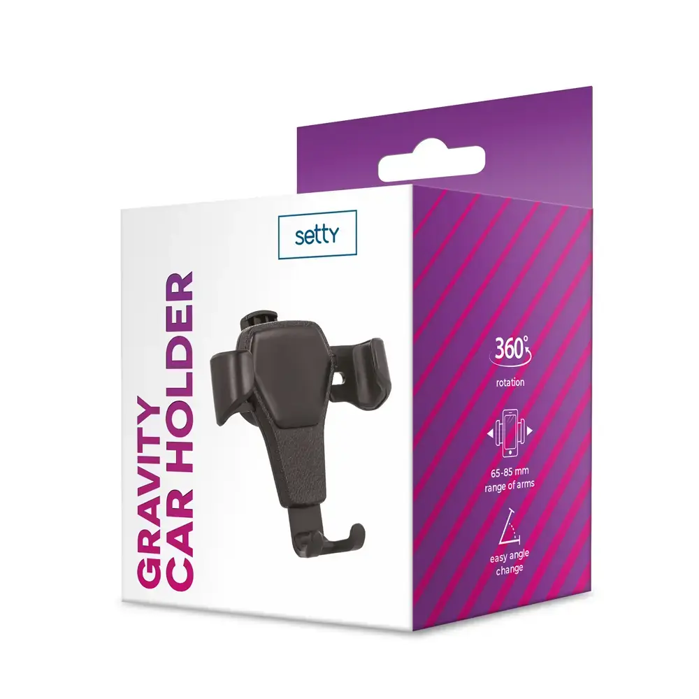 Gravity air vent car holder for smartphones enables convenient location of a mobile device in sight and within reach of the user. The holder matches most of the smartphones available on the
