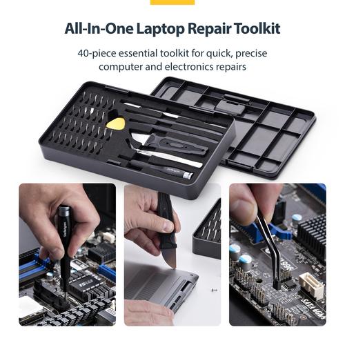 To streamline repairs, the detachable case lid doubles as a portable sorting tray and includes a magnetic pad to securely hold screws and small components, keeping the workspace organized and efficient.StarTech.com 40-Piece Computer Repair Toolkit for Laptop/PC/Electronics/Phone, 30-Bit Precision Screwdriver Set, Removable Lid with Magnetic Pad, Prying Tools. Type: Toolkits, Best uses: Computer, Mini PC, Mobile phone/Smartphone, Laptop, Server, Tools included: Magnetic parts mat, SIM eject tool, Screwdriver, Spudger, Tweezer. Width: 150 mm, Depth: 250 mm, Height: 34.5 mm. Tools quantity: 40 tools, Package width: 270 mm, Package depth: 150 mm. Master (outer) case width: 22 mm, Master (outer) case length: 325 mm, Master (outer) case height: 245 mm