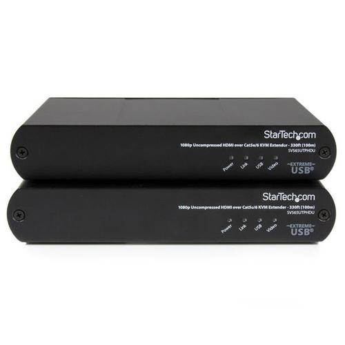 - Save time and money by extending over an existing Cat 5e / Cat 6 infrastructure cablingStarTech.com USB HDMI over Cat 5e / Cat 6 KVM Console Extender w/ 1080p Uncompressed Video - 330ft (100m). Type: AV transmitter & receiver, Connectivity technology: Wired, Maximum transfer distance: 100 m. Transmitter video port type: HDMI, Transmitter local keyboard/mouse port type: USB. Receiver local video port type: HDMI. AC input voltage: 100-240 V, AC input frequency: 50 - 60 Hz, AC adapter output voltage: 5 V. Package width: 214 mm, Package depth: 375 mm, Package height: 103 mm