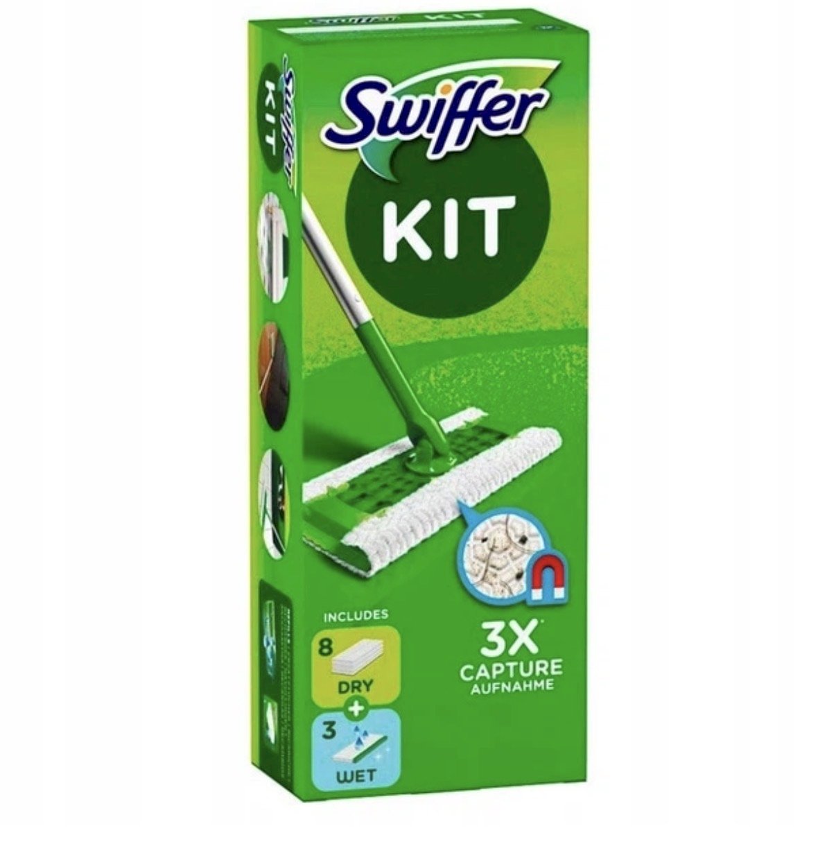 Swiffer Sweeper Starter Kit (Mop + Cloths), 1 set is a versatile cleaning solution from the Swiffer brand designed for both dry and wet floor cleaning, including a mop with a 360° rotating head, 8 dry cloths for dust collection and 3 wet cleaning cloths, allowing effective removal of dust, hair, pet fur and dirt from various hard floor surfaces such as tiles, laminate and vinyl; the dry cloths use electrostatic action to attract and trap up to three times more dust and debris than a traditional broom, while the wet cloths dissolve dirt, absorb it and leave a fresh clean scent, and the lightweight, maneuverable mop design makes it easy to clean hard-to-reach areas like under furniture, making this kit ideal for quick and regular home cleaning.
