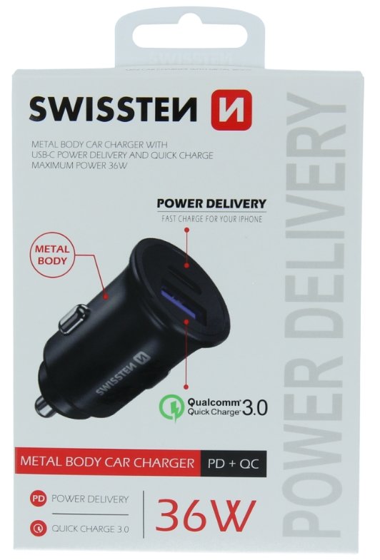 Swissten Metalline autoadapteriga, mis pakub USB-C + Kiire Toit 3.0 / 36W, mobiiltelefonide ja tabletite jaamiseks (SW-CCH-ME2-QC3.0-PD-36W-BK)