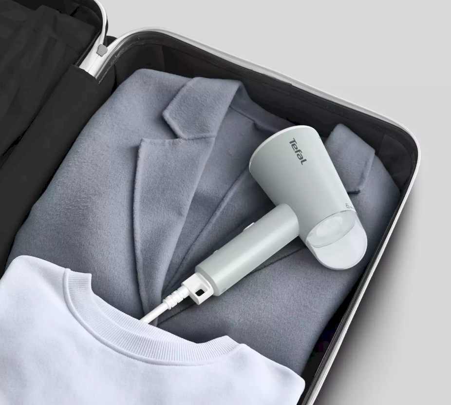 The Tefal Origin Travel DT1034 Handheld Garment Steamer is a compact and travel-ready steaming solution designed to quickly refresh and remove wrinkles from clothing wherever you are. With 1200 W of power, it heats up in about 25 seconds and delivers a continuous steam output of up to 20 g/min, making it ideal for everyday fabric care at home or on the go. The 0.07 L removable water tank with indicator allows easy filling and monitoring, while vertical steam capability makes ironing boards unnecessary. Lightweight and portable, it comes with a textile brush and travel pouch to handle thicker fabrics and to store the device conveniently when travelling. The 2 m cord and foldable design add flexibility and ease of use. Technical Specifications: Power: 1200 W Water tank capacity: 0.07 L (removable) Continuous steam output: up to 20 g/min Warm-up time: ~25 s Vertical steam function: Yes Control type: Buttons Ready indicator: Yes Cord length: ~2 m Accessories: Textile brush, travel pouch Foldable/travel-friendly design Approximate dimensions (W × D × H): ~86 × 160 × 244 mm Net weight: ~0.75 kg Colour: Light Green/White