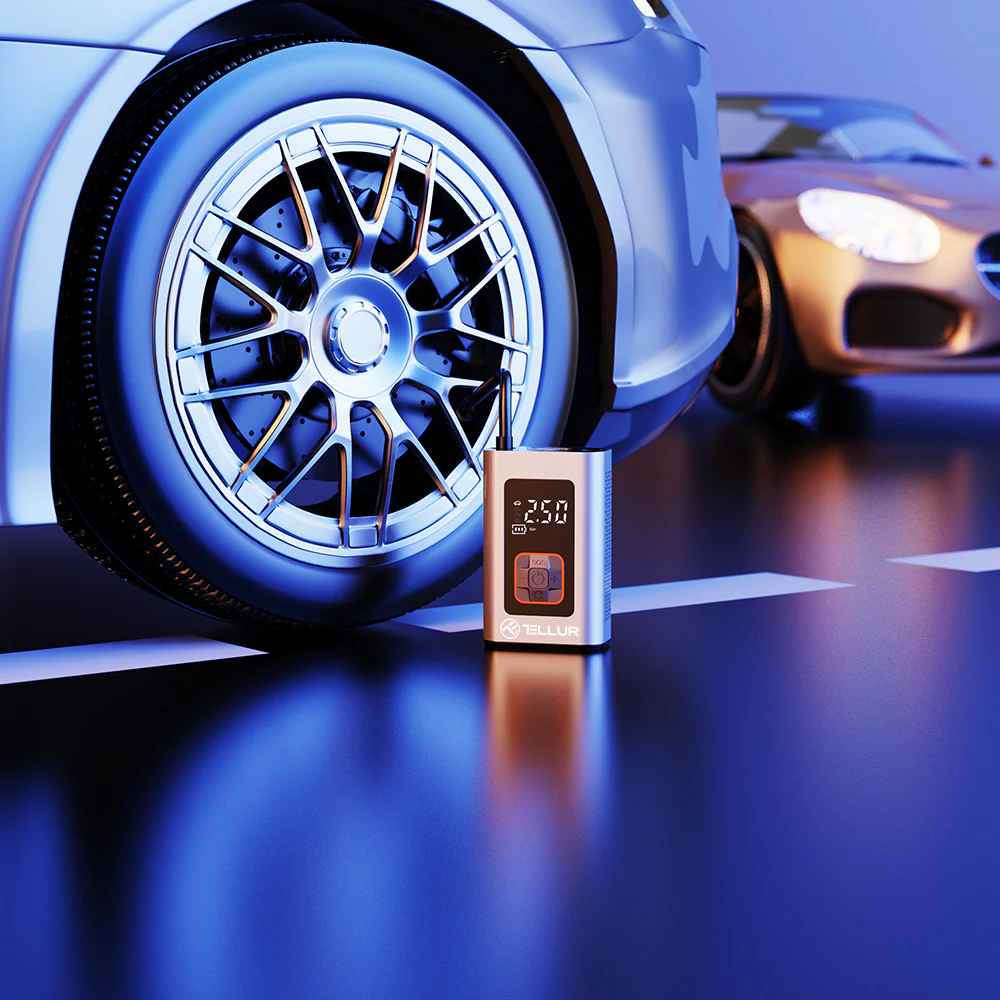 The Tellur portable air compressor is a cordless tire inflator with four preset modes for cars, bikes, motorcycles, and balls. Made of durable aluminum alloy with dual cooling vents for fast heat dissipation. Features a large LCD screen for real-time pressure monitoring.