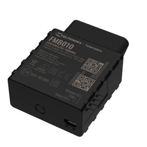 FMB010 on lihtne OBDII Plug and Play jälgija GNSS-, GSM- ja Bluetooth-ühendusega. FMB010 sobib suurepäraselt kerendavate sõidukite jälgimiseks sellistes rakendustes nagu kullerteenistus, autorent ja -liisimine, kindlustustelemaatika ning paljudes teistes kohtades, kus lihtne integreerimine on hädavajalik. Seade toetab temperatuuri/niiskuse andureid, vabakäes kõnesidet, püsivara ja konfiguratsiooni värskendamist Bluetoothi kaudu. Teltonika FMB010. Eesmärk: Auto, Toote värv: Must, Kaitseomadused: Tolkivastane. Sisemälu maht: 0,128 GB. USB-ühenduse tüüp: Micro-USB. Aku tööaeg (maks): 4 h, Aku tehnoloogia: Liitium-ioon (Li-Ion), Aku pinge: 3,7 V. Kaal: 63 g, Laius: 50,7 mm, Sügavus: 49,6 mm