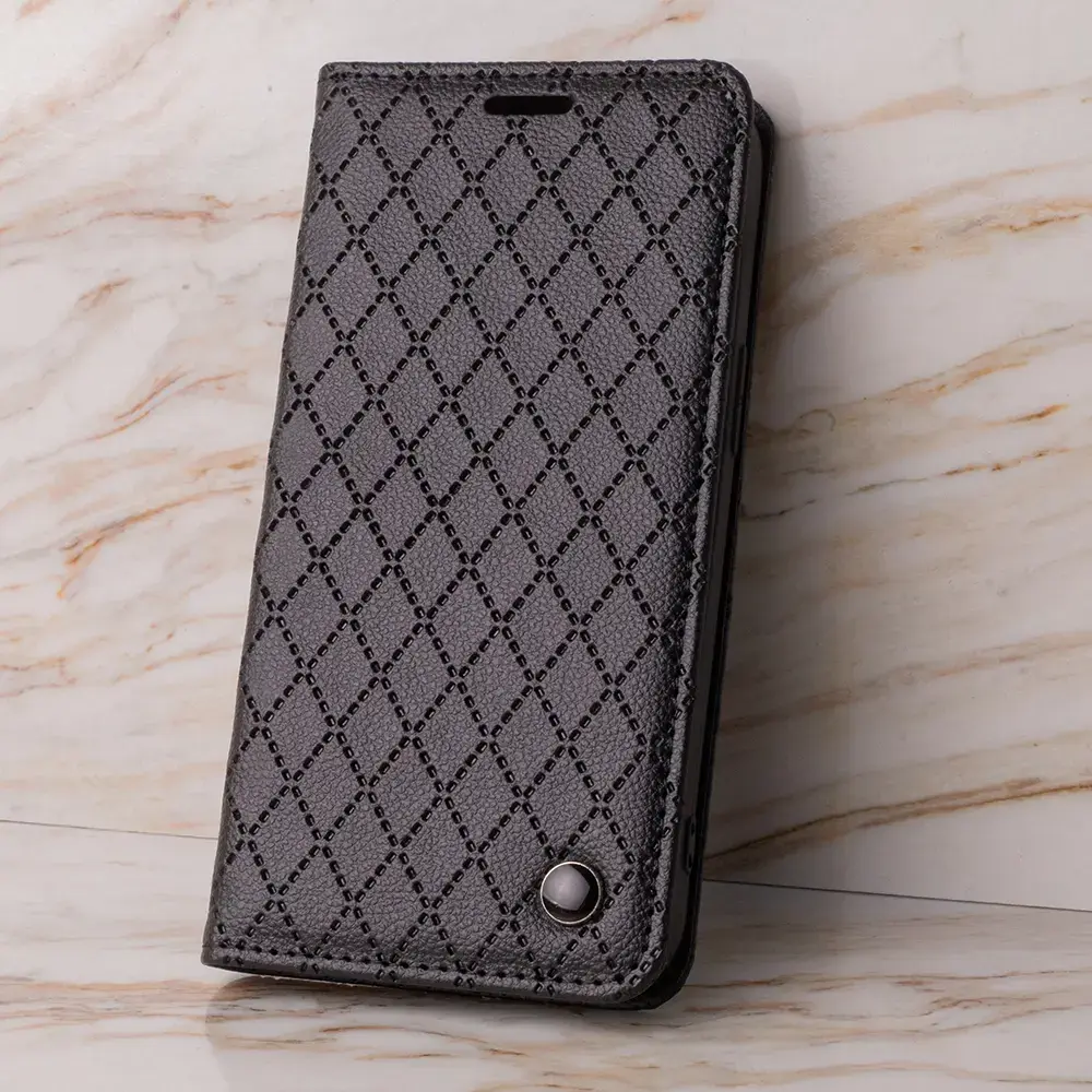 The Smart Caro phone cover is made with precision and attention to detail. It features an artificial leather finish with a distinctive checkered pattern. In the lower right corner, there is a black round button that has a glossy finish. This elegant and functional case is the perfect protection for your smartphone, which will also add a unique character to it.
