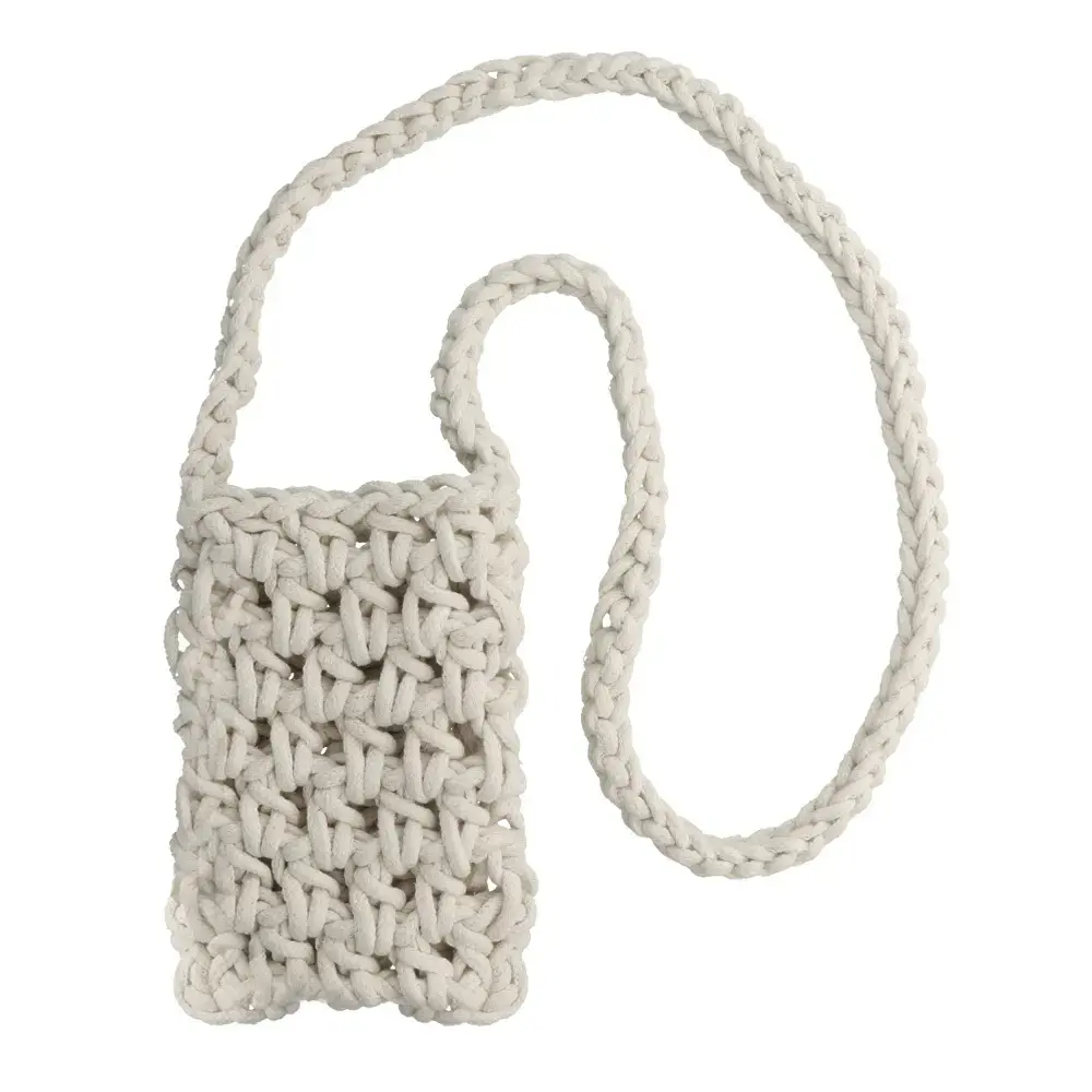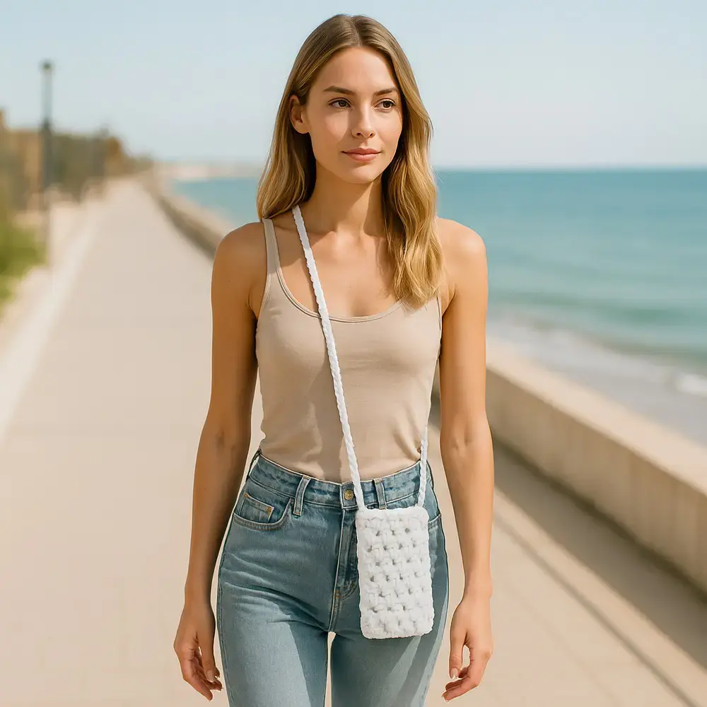 Phone Bag – Design 1 White | Boho Style with Handmade Crochet Handwoven design – Crafted from thick yarn in a stylish macrame-like crochet pattern. Perfect for essentials – Holds your phone, cards, keys, and other small items. Stylish accessory – Lightweight and easy to wear – ideal for beach days, walks, festivals, or casual outfits. Universal strap – Long, soft strap allows you to wear it over the shoulder or around your neck. Add charm to your summer look with this beige phone bag inspired by handmade and slow fashion trends. Technical specifications: Design: 1 Color: White Material: Thick cotton yarn Size: 10 cm (width) × 20 cm (height) Functions: For phone, keys, documents Strap: Woven, long, for shoulder or neck