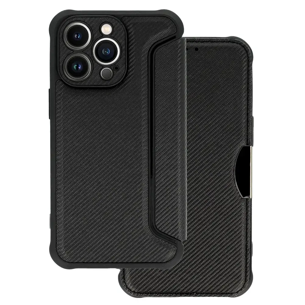 Razor Carbon Book Case - combines a sleek and modern case with excellent protection for our device. It is made of high-quality materials with special attention to every detail. The flexible attachment of the phone made of thermo-shrinkable polyurethane (TPU) adapts to the respective model. Made of eco-friendly leather, thermoshrinkable polyurethane (TPU) and microfibre (interior of case). Lined with the ever-popular carbon pattern material Magnet closure With practical pocket for essential documents Reinforced corners to absorb the force of impact Built-in camera island for extra protection Protects the phone from falls and absorbs shocks Cut-outs for camera, charger, earphones etc. Charges phone without removing phone from case Fits perfectly with your phone