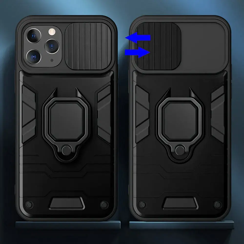 Ring Lens Case - this case is perfect for extreme conditions. The case protects the back, sides, camera and screen of the smartphone. With this case you don't have to worry about your phone! Scratch and drop protection Hybrid design - flexible TPU and hard PC Sliding slider, thanks to which we will protect the rear camera of our smartphone Built-in Ring Bracket for a more secure hold of the phone in your hand. It also serves as a stand, e.g. when watching movies or video-calls Metal plate enabling the use of magnetic car holders Reinforced corners to absorb the impact force Protruding rims provide additional screen and camera protection Necessary cutouts guarantee easy access to all ports Integrated buttons prevent dust and dirt from getting under the case Non-slip silicone keeps the phone firmly in your hand Charging the phone without removing it from the case ATTENTION - the ring may interfere with inductive charging, it is recommended to remove the phone from the case when you want to charge the device using QI charging.