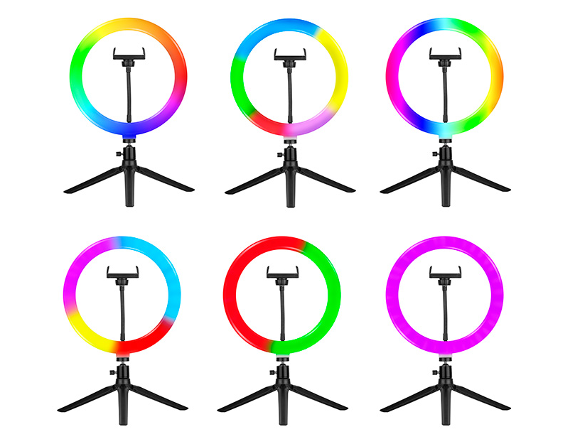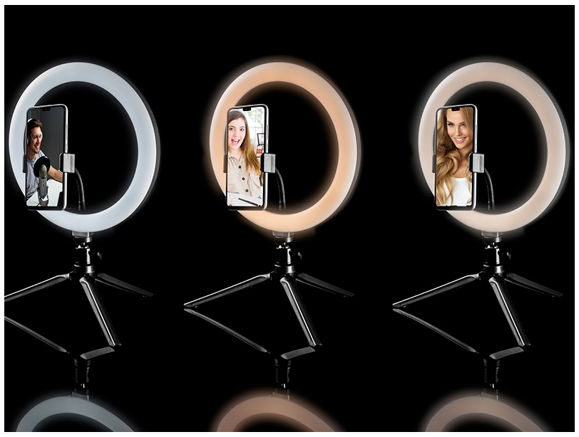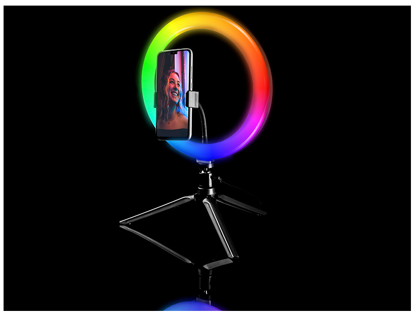 RGB RING LAMP TRACER 26CM WITH TRIPOD DESCRIPTION • Useful luminous flux of 600-1700 L. • 153 LEDs. • 18 colors of light. • Pilot. • Lamp diameter 26 cm. • Phone stand. • Color temperature 2800-7000 K. • Compact size. TECHNICAL DATA Material: Carbon steel, aluminum, ABS Power (W): 7.5W - 1.5A Weight of device (in g): 380 Power supply (V): DC 5V Diameter (cm): 26 Colour temperature (K): 2800 - 7000 Brightness (lm): 600 - 1700 Tripod height: 9 cm LED type and qty: 33 diodes 5050 RGB & 120 diodes 2835 Remote control: wireless Energy efficiency class: F