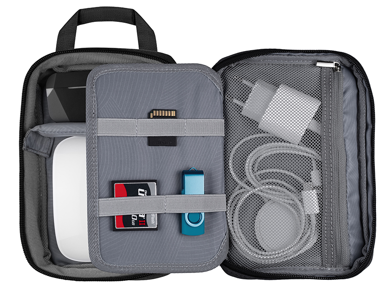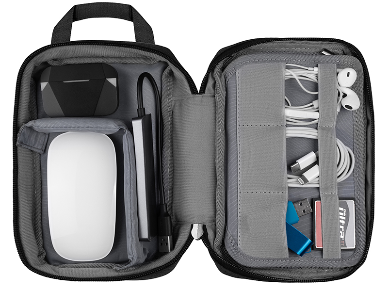 Compact Size: 21x14x5 cm, fits easily in hand luggage. Multiple Pockets: Inner and outer zippered pockets for added organization. Mesh Compartments: Ideal for storing chargers and accessories. Dedicated Spaces: For mouse, memory cards, and cables. Protection: Rubber elastic straps protect contents from damage and moisture. Quality Materials: Ensures basic protection and easy opening/closing with a smooth zipper. Travel-Friendly: Keeps small items and electronics safe and organized.