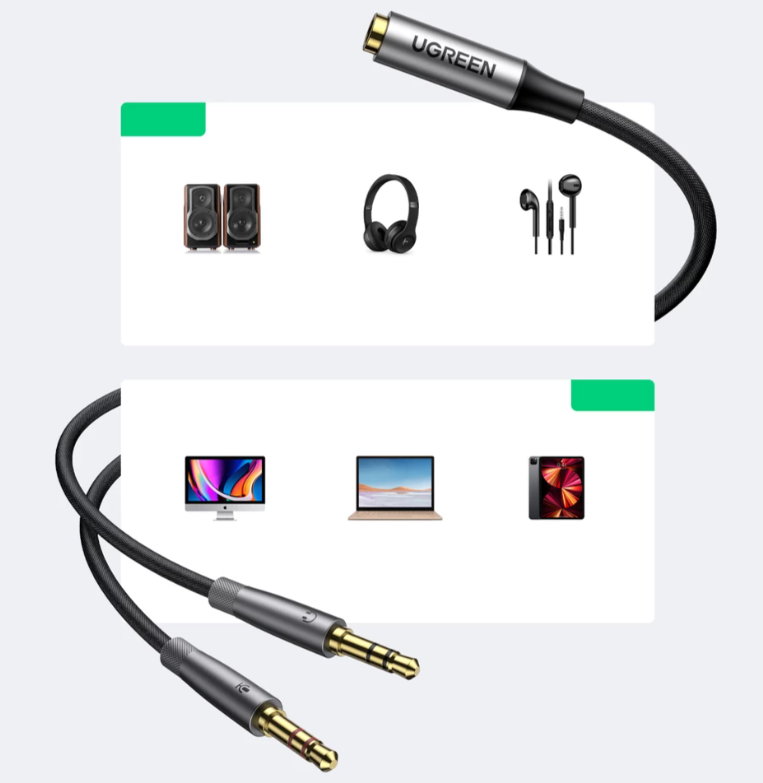 AUX audio splitter for headphones with microphone The UGREEN splitter offers many possibilities. It allows you to connect your headphones to the splitter to freely listen to music, watch movies or make calls. Compatible with all devices that support 3.5 mm mini jack input. It has two ends, which plug into your computer or laptop (one for the headphone input and the other for the microphone). Easy to use Ugreen AV192 will provide you with a range of interesting experiences related to the world of music. Just plug your headphones, speaker or microphone into the mini jack of your laptop. Both plugs are marked with icons corresponding to their functions to make it even easier to use while listening to your favorite songs. Superior sound quality Hi-Fi stereo technology provides crystal clear sound and smooth transmission without any distortion. The right balance of high and low tones perfectly reproduces the smallest detail, letting you enjoy new experiences. Wide compatibility The cable is designed to work with a wide range of devices, so you can use it in tons of different ways. Connect your phone or TV to the amplifier to listen to your favorite songs the way you want. Its versatility will also work well with TVs, speakers, and audio mixers. Durable design The product is designed to last surprisingly long. A special coating protects against minor mechanical damage such as abrasion or breakage. The entire cable is reinforced in the most vulnerable places. All this makes the AV192 suitable for any situation. Brand Ugreen Model AV192 Interface AUX, gold-plated tips Wire Diameter 3.5 mm Material Nylon + Aluminum Length 20 cm