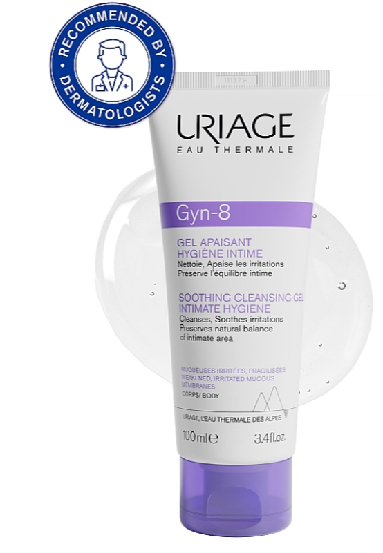 Uriage Gyn-8 Intimate Hygiene Soothing Cleansing Gel tundub pehme kehast, kiiresti vähendab ärevust ja aitab taastada intiimse ala loomulikku tasakaalu.