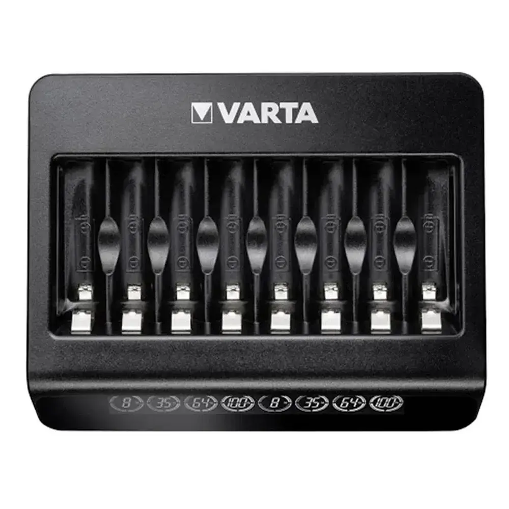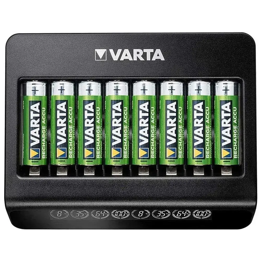 The VARTA LCD Multi Charger+ is an advanced device that combines functionality with modern design. It is ideal for charging NiMH rechargeable batteries in sizes AA, AAA. With the ability to charge up to 8 cells simultaneously and individual charging channels, it offers flexibility and optimal results. The intuitive LCD display makes it easy to monitor the charging process, while advanced safety features such as Minus Delta V method, timer shut-off, and short-circuit protection ensure reliable and secure use. Technical Specifications: