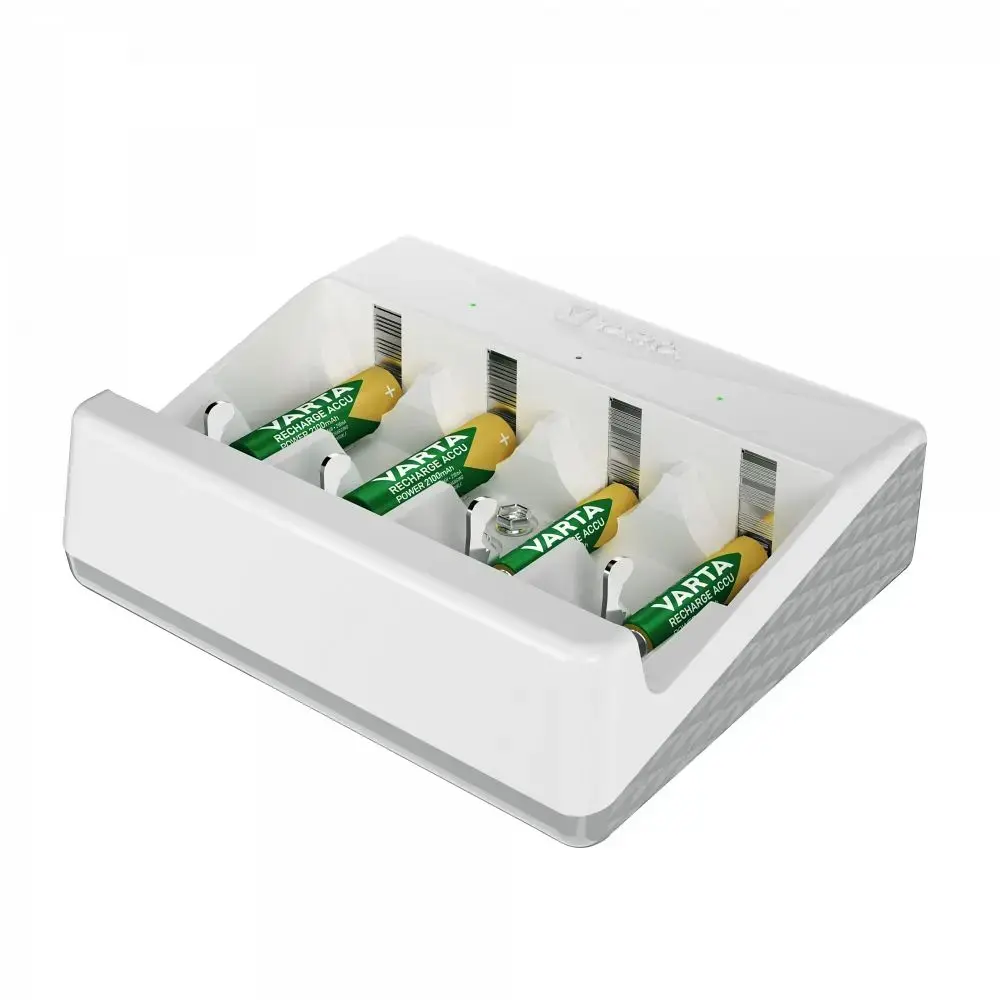 The VARTA Universal Charger is a versatile and reliable device, ideal for charging NiMH rechargeable batteries in sizes AA, AAA, C, D, and 9V. With the ability to charge 2 to 4 cells simultaneously and advanced safety features, it ensures fast and efficient charging. Green LED indicators provide updates on the charging process, while the trickle charging function guarantees optimal results. Technical Specifications: