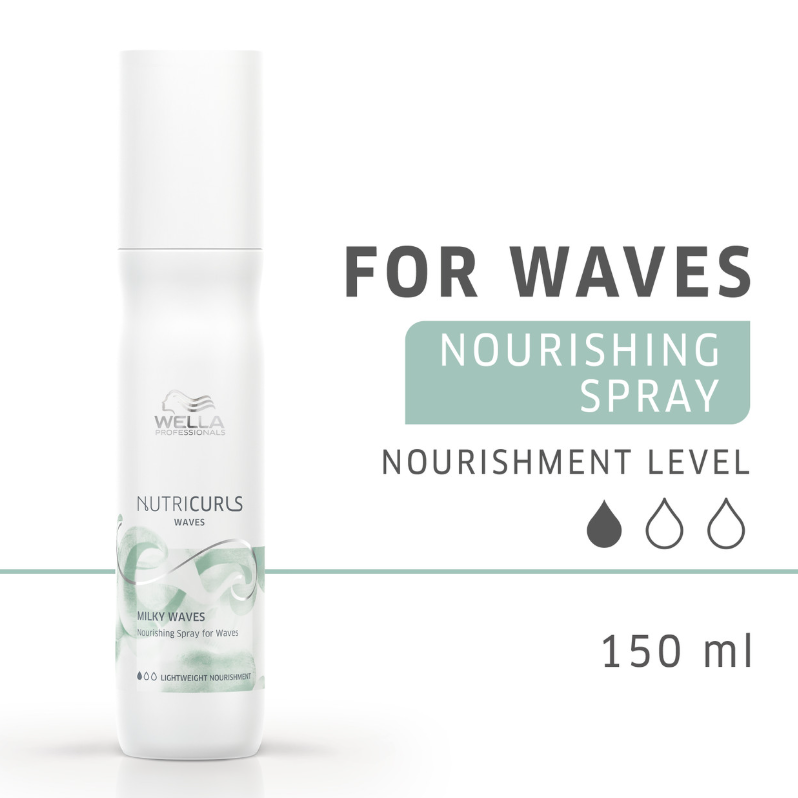 Wella Professionals Nutricurls Milky Waves Leave-In Spray 150 ml is a professional care product for wavy and curly hair. Its lightweight texture moisturizes hair, enhances curl definition, and adds elasticity without weighing hair down. The spray is enriched with nourishing ingredients and oils that protect hair from breakage, restore softness, and add natural shine. Suitable for daily use, it makes detangling easier and helps maintain wave and curl structure. Key features: moisturizes and nourishes hair; enhances waves and curls; lightweight formula, does not weigh hair down; protects from breakage and adds shine; suitable for daily use. How to use:Spray onto clean, towel-dried hair, distribute evenly with hands or comb, then style as usual.