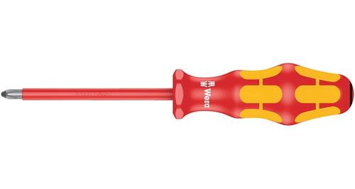 Wera VDE screwdrivers with multi-component Kraftform Plus handle for fast and low-fatigue working: hard gripping zones for high working speeds whereas soft zones ensure high torque transfer. Individually tested in water bath at 10,000 volts for secure work at the permissible voltage of 1,000 volts. “Take it easy" tool finder with colour coding according to profiles and size stamp – for simple and rapid accessing of the required tool. The hexagonal anti-roll feature prevents any bothersome rolling away at the workplace.Wera 05006164001. Width: 26 mm, Length: 105 mm, Height: 26 mm