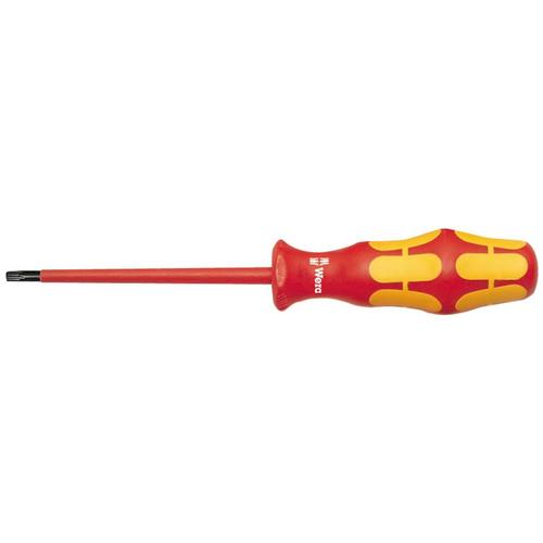 Wera VDE screwdrivers with multi-component Kraftform Plus handle for fast and low-fatigue working: hard gripping zones for high working speeds whereas soft zones ensure high torque transfer. Individually tested in water bath at 10,000 volts for secure work at the permissible voltage of 1,000 volts. “Take it easy” tool finder with colour coding according to profiles and size stamp – for simple and rapid accessing of the required tool. The hexagonal anti-roll feature prevents any bothersome rolling away at the workplace.Wera 05006178001. Length: 205 mm