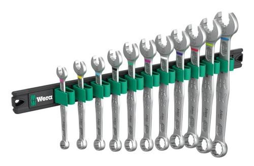 Ring spanner set, 11-piece set, metric sizes; on a magnetic rail. With the combination of the 7.5° offset open end and the double hexagon geometry, the Joker 6003 doubles the placement points. A repeated 180° turn of the wrench around the longitudinal axis during screwdriving provides four placement possibilities, and bolts or screw heads can be engaged every 15°. This makes screwdriving much easier, especially in confined spaces. The slim yet robust ring side is tilted by 15° to the tool axis. The high-quality surface treatment achieves a high and long-lasting corrosion protection. With Take it easy Tool finder: Colour coding by size. The clips hold the tools perfectly. With its strong magnet, the rail holds securely to metal surfaces. It can also be bolted to the wall.