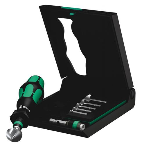 8-piece countersink bit set in a stable plastic box for countersinking and deburring. The hexagonal shaft ensures very good power transfer. Ensures rattle and score-free working. Perfect chip removal and great durability. High quality, ergonomic bit holder equipped with a magnet. The Rapidaptor ensures rapid bit change without any extra tools. For insertion in the power screwdriver or for use in the chuck of the electric drill.Wera 05104655001. Weight: 390 g. Country of origin: Czech Republic