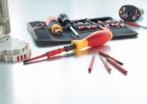 The fully certified TorqueVario®-S VDE torque system provides controlled screw tightening combined with safe use for electric installations. The tool set contains an ergonomically shaped torque screwdriver with an integrated numeric scale, 15 slimBits, a bit holder and an adjusting tool. All components are arranged practically in a high-grade, hard-wearing bag, where they are easy to identify. The VDE torque screwdriver covers a wide variety of applications with a torque range between 0.8 and 5.0 Nm. A clearly audible, physically perceptible signal emitted when the torque is produced guarantees process safe torque mechanics, protecting against damage to materials and eliminating the need for retouching. With a release accuracy of +/- 6%, the torque tool complies with EN ISO 6789 requirements. The insulated ClicFix bit holder guarantees a secure hold for 75 mm long slimBits thanks to mechanical blade locking. Both the torque screwdriver and the slimBits undergo an individual piece test as per the international IEC 60900 standard, allowing users to work safely on live parts up to 1,000 V AC.Wiha 36791. Weight: 554 g