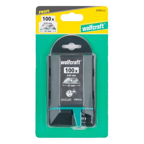 The trapezium blades for all wolfcraft trapezium blade knives are 0.65 mm thick and 61 mm long. You can store the 100 replacement blades safely in the practical storage box.wolfcraft GmbH 4309000. Quantity per pack: 100 pc(s), Width: 18.7 mm, Thickness: 0.65 mm