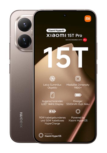 15T Pro Leica 5x Pro Teleobjektiv, Spotlight Photography Leica Summilux Objektiv Bleib in Verbindung mit Xiaomi Astral Communication MediaTek Dimensity 9400+ Schlankes, abgerundetes Gehäusedesign The Gold Collection Ultradünner Displayrahmen an allen vier Seiten 6,83" 144Hz augenschonendes Display 90W kabelgebundenes und 50W kabelloses HyperCharge Langlebiger 5500mAh Akku - 3 Monate YouTube Premium Zugang - 3-monatige kostenlose Testversion von Google AI Pro - Kostenlos 4 Monate Spotify Premium Bringt Meisterwerke ganz nah Professionelle Leica Optik Leica 5x Pro Teleobjektiv Ganz nah am Geschehen Das erste 5-fach-Teleobjektiv der Xiaomi T Series mit 5-fachem optischem Zoom, 10-fachem optischem Zoom, 20-fachem und noch stärkerem Ultra-Zoom in Kombination mit Leica Optik bringt dich hautnah an das Geschehen heran. optischer Zoom 5-facher Zoom auf optischem Niveau 10-facher Ultra-Zoom 20-facher Spotlight Photography Momente einfangen ? selbst aus der Ferne Ob Siegerpodest oder Hochzeitszeremonie ? das Teleobjektiv erfasst jeden Augenblick mit atemberaubender Klarheit und bringt dich direkt in den Mittelpunkt des Geschehens. Fesselnde Momente, greifbar nah Mit außergewöhnlicher Tele-Performance und leistungsstarken Kompressionseffekten wird jede Aufnahme noch eindrucksvoller. Glanzmomente ohne Ende Das Super-Teleobjektiv fokussiert Fotos für unverwechselbare Erzählungen. Ultra-Zoom Weiter, als du sehen kannst AI-Computerfotografie nimmt gestochen scharfe Bilder in ungeahnten Distanzen auf. Leica Dreifach-Kamera Die Vielseitigkeit einer professionellen Kamera Das Setup der Flagship-Dreifach-Kamera nimmt breite, entfernte und scharfe Bilder auf ? atemberaubende Fotos, mühelos. 115mm Leica 5x Pro Teleobjektiv auf Profiniveau 50MP Sensor Bis zu 100-facher Zoom ?/3,0 Optische Bildstabilisierung (OIS) 23mm Leica Hauptkamera auf Profiniveau 50MP Sensor Light Fusion 900 2,4µm 4-in-1-Superpixel ?/1,62 7P Objektiv Optische Bildstabilisierung (OIS) 15mm Leica Ultraweitwinkelobjektiv 12MP Sensor ?/2,2 Hauptkamera Leica Summilux Objektiv Kristallklare Bildqualität für fesselnde Fotos Das Leica Summilux Objektiv mit seiner extrem großen Blendenöffnung und seiner außergewöhnlichen optischen Leistung gibt beeindruckende Farben präzise wieder und liefert auch bei schlechten Lichtverhältnissen klare, fesselnde Details. - Asphärisches 7P-Objektiv mit hoher Lichttransmission - Blendschutz-Linsenbeschichtung - Rotationsbeschichteter Infrarotlichtfilter - Geschwärzte Linsenränder Hauptkamera Light Fusion 900 Sensor mit hohem Dynamikbereich Durch einen klassischen Flagship-Sensor mit einem hohen Dynamikbereich von 13,5EV, der mit Profikameras vergleichbar ist, erfasst die Kamera atemberaubende Licht- und Schattenmomente. - 13,5EV Hoher Dynamikbereich - 1/1,31 Zoll Großer Sensor - 2,4µm 4-in-1-Superpixel Ein außergewöhnliches Erlebnis von Licht und Schatten Selbst bei schwierigen Lichtverhältnissen wie starkem Licht oder Gegenlicht bleiben reichhaltige Licht- und Schattendetails erhalten, die den Bildern mehr Tiefe und Dimension verleihen. Dreifach-Kamera-System, fünf Brennweiten Fotografieren wie ein Profi Mit einem Fokusbereich von 15 bis 230mm und gleichmäßiger Zoomfunktion kannst du weit und nah fotografieren. Master Portrait Jede Aufnahme ein Meisterwerk Das neue Upgrade zum Master Portrait-Algorithmus unterstützt mehrere Brennweiten und verschiedene Lichtverhältnisse. Einfach den Auslöser drücken, um lebensechte Porträts ganz leicht aufzunehmen. Leica Street Photography Flüchtige Momente festhalten ? jederzeit und überall Der Leica Street Photography Modus ermöglicht ultraschnelle Aufnahmen, klassische Brennweiten und charakteristische Farben. So lassen sich authentische Momente mühelos festhalten. Blitzschneller Start Die Kamera lässt sich selbst über den Sperrbildschirm schnell öffnen, damit du nie einen wichtigen Moment verpasst. Klassische Brennweiten Verschiedene Brennweiten (28mm, 35mm, 50mm, 75mm und 135mm) ermöglichen mehr Vielfalt bei der Straßenfotografie. Verbesserter Sucher Ermöglicht eine schnelle Vorschau der Komposition während der Aufnahme und sorgt so für perfekt komponierte Bilder. Xiaomi AISP 2.0 und den AI-Kreativitätsassistenten entdecken Ganz nah dran an grenzenloser Kreativität Videoaufnahmen auf Profiniveau 4K, 120fps3 Ultraflüssige Videos Flüssigere und klarere Bilder, die unglaubliche, noch nie dagewesene Momente einfangen. 10-Bit-Log 4K, 60fps Bewahrt möglichst viele Details in den Bildern, für mehr kreative Möglichkeiten in der Nachbearbeitung. LUT Benutzerdefinierter Import Im professionellen Modus wird der Import verschiedener LUTs unterstützt, um unterschiedliche Farbtonstile und visuelle Effekte zu erzielen. 3-Mikrofon-Array Stereoaufnahme Durch drei Mikrofone auf Studioniveau mit hohem Signal-Rausch-Verhältnis wird mithilfe von räumlichen Daten aus 3 Mikrofonen und Algorithmen eine authentische Audiodirektionalität erzeugt. HDR10+ für mehrere Brennweiten Lebendige Farben und starke Kontraste Sattere, lebendigere Farben mit dimensionsgerechter, realistischerer Licht- und Schattenwiedergabe. Beeindruckende Gestaltung Flagship-Design Minimalistisch und schön für einen High-End-Look In der Einfachheit liegt die Kunst: Die Rückseite aus Glasfaser fügt sich nahtlos in den Metallrahmen ein, als ob sie zu einer Einheit verschmelzen würden. Jedes Detail ist ein Ausdruck reiner Schönheit. Schlankes, abgerundetes Gehäusedesign Weiches Material, angenehm zu halten Weich abgerundete Konturen und eine matte Oberfläche schaffen ein raffiniertes, ausgewogenes und mühelos elegantes Design. Innen wie außen außergewöhnlich Widerstandsfähigkeit für sorgenfreie Nutzung IP68 Wasser- und Staubschutz4 Verbesserte Wasserbeständigkeit bis zu einer Tiefe von 3m. Verbesserte Kratzfestigkeit Mit Corning Gorilla Glass 7i für ein sicheres Gefühl. Optimierte Sturzfestigkeit Mit einem hochfesten Rahmen aus Aluminiumlegierung und einer R
