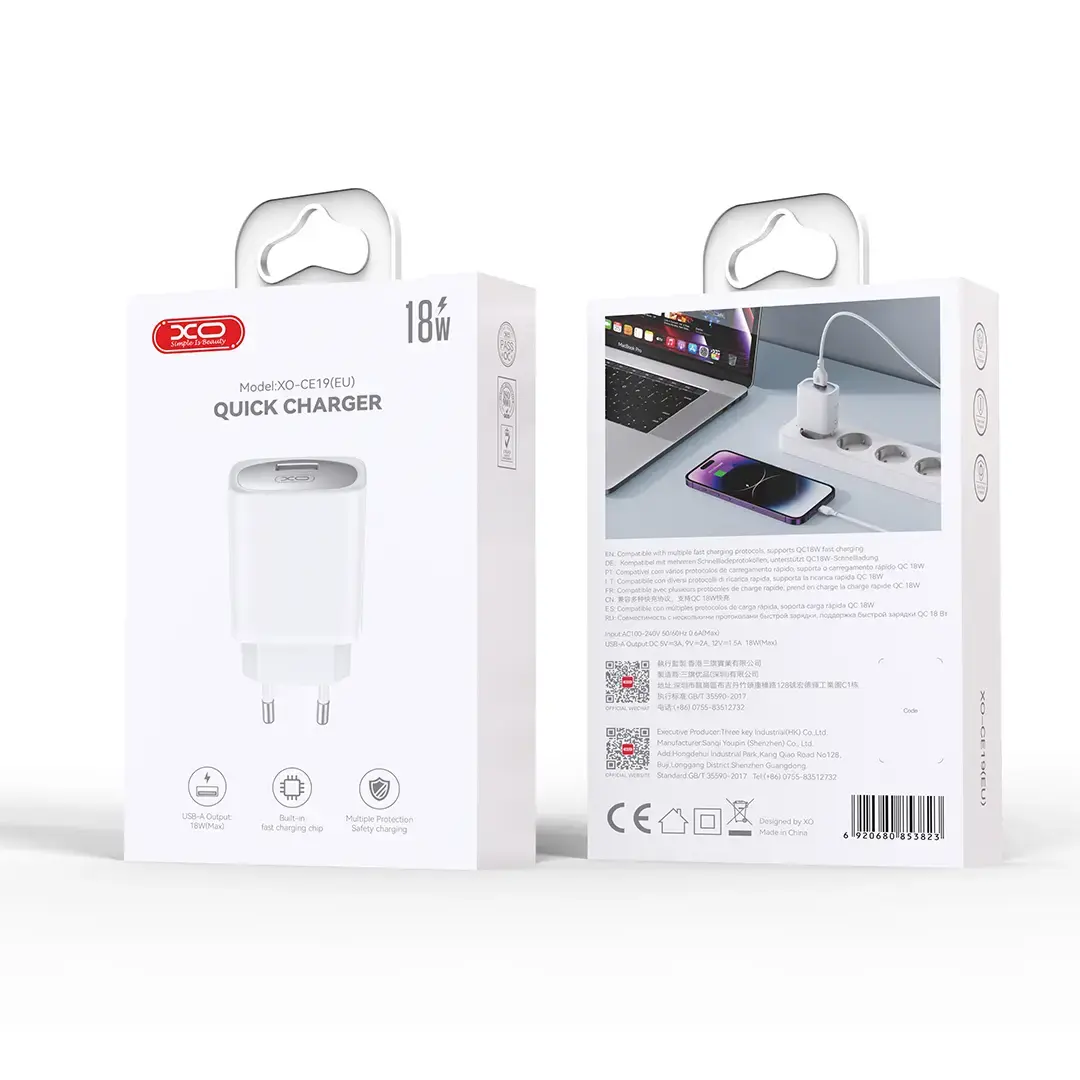 This charger is meticulously crafted for modern smartphones and devices, ensuring seamless and rapid charging performance. With its 18W power output and Quick Charger (QC) capability, it delivers efficient charging while prioritizing device safety. The sleek white design exudes elegance, complemented by USB-A connectivity for hassle-free charging on the go.