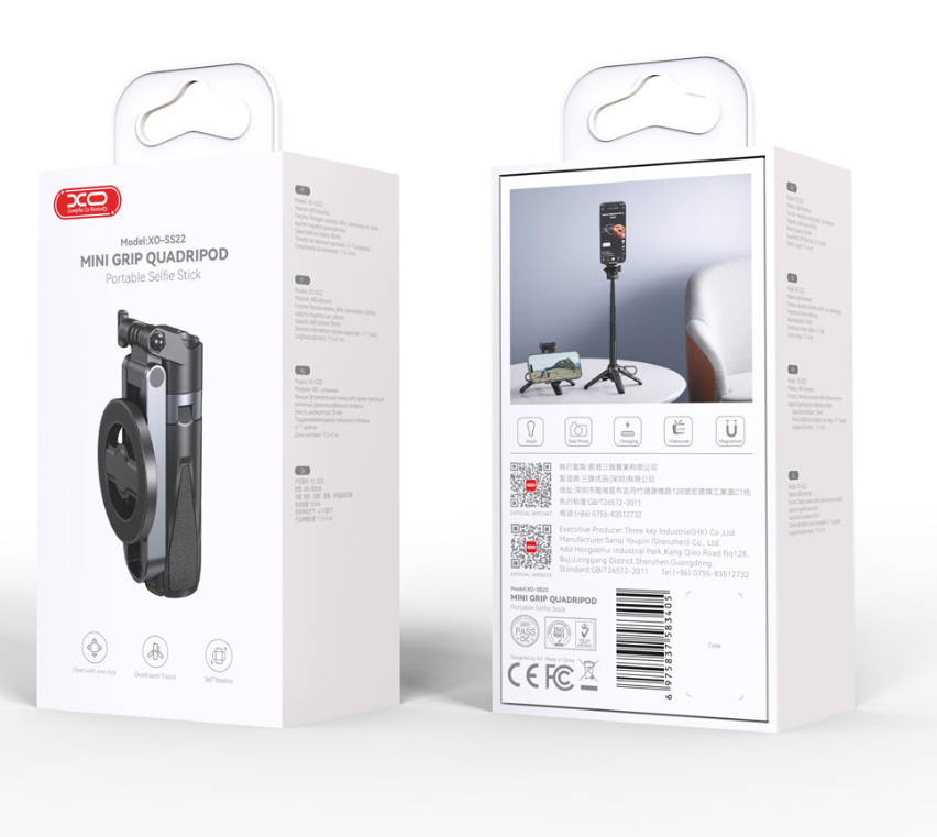 The XO SS22 is a compact and versatile 4‑in‑1 mini selfie stick featuring a magnetic phone/camera mount. It functions as a monopod, tripod, ring light, and magnetic holder—all in one. Technical Specifications: Type: 4in1 selfie stick / tripod Functions: monopod, tripod, ring light, magnetic mount Compatible with smartphones and action cameras Material: aluminum and plastic Maximum height: up to 95 cm Folded size: approx. 20 cm Ring light length: integrated into the holder Power source: built-in rechargeable battery (USB charging) Color: black