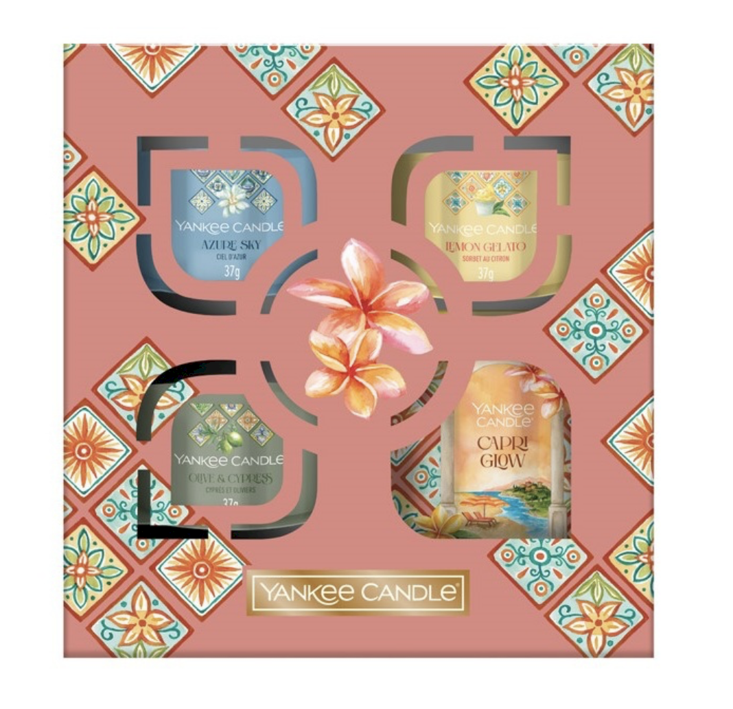Package contents 1 × small glass tumbler candle 3 × glass votive candles with integrated wick Fragrances included Capri Glow – fresh citrus fragrance Azure Sky – fruity citrus scent Lemon Gelato – fresh fruity lemon aroma Olive & Cypress – fresh fruity scent with woody notes Technical features Candle type: Glass votive candles and tumbler candle Burn time (per votive candle): up to 10 hours Wick: Integrated Flame: Bright and stable Ready to use without additional holder