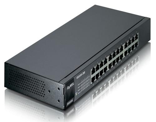 The ES1100-8P and ES1100-16P support IEEE 802.3af PoE to ease installation in challenging spaces such as ceiling or wall mounting. It works with devices such as WLAN APs, VoIP phones and IP surveillance cameras that can be powered by Ethernet connectivity over CAT-5 cables less than 100 meters (300 feet) in length; so there is no need for extra power adapters, and powering the devices installed on the ceiling is no longer a headache. This feature helps enterprises to reduce installation time and cost when many new devices are needed.Zyxel ES1100-24E. Switch type: Unmanaged. Basic switching RJ-45 Ethernet ports quantity: 24. MAC address table: 8000 entries, Switching capacity: 4.8 Gbit/s. Networking standards: IEEE 802.1p, IEEE 802.3, IEEE 802.3af, IEEE 802.3az, IEEE 802.3u, IEEE 802.3x. Power connector: DC-in jack