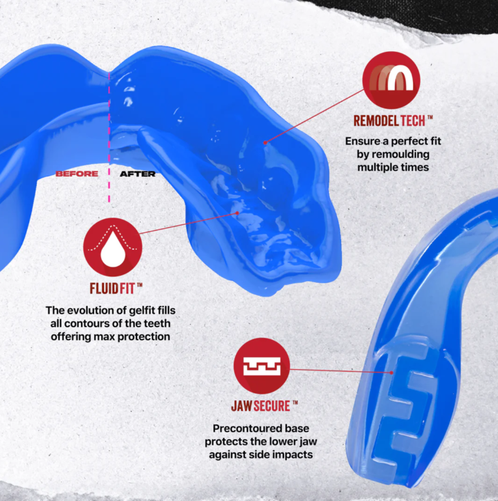 See Safejawzi Extro seeria suukaitse on optimaalse pehmenduse tagamiseks valmistatud kahest kihist. Fluid-Fit kasutatakse selleks, et kaitse saaks täielikult teie hammaste külge hallitada. See tähendab, et see püsib treeningu ajal ideaalselt paigal. Safejawzi Jaw-Secure tehnoloogia tagab, et teie alumised hambad on endiselt kaitstud, hoolimata asjaolust, et tegemist on ühe suukaitsega. Põhja ainulaadne kuju võimaldab klõpsata oma alumised hambad justkui suukaitsesse. See tähendab, et nii hambad kui ka lõualuu on ideaalselt kaitstud. Suukaitse suurust saab muuta kuni 3 korda, kui te ei ole sobivusega täielikult rahul.