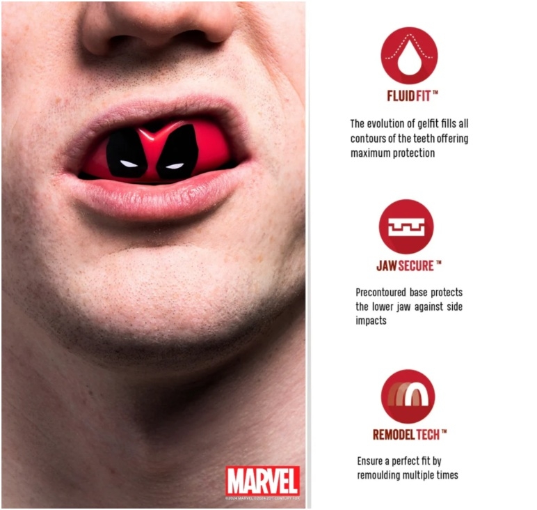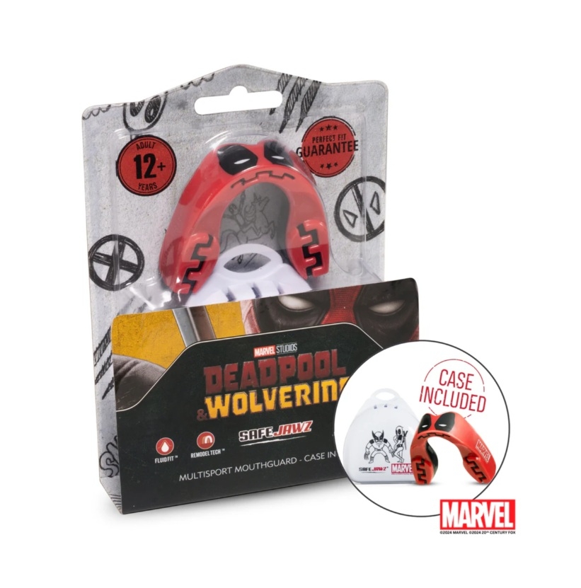 Nad kutsuvad mind suuga halduriks"-kaitsja. On aeg katanad välja võtta ja meie Deadpooli suukaitsega oma lemmikpalgasõdurite antikangelase vaim võtta. Selle Fluid Fit™ tehnoloogia tähendab, et SAFEJAWZ® kaitsmetel on üliõhuke profiil ja suurepärased hoidmisomadused. Kaitsmed kinnituvad praktiliselt hammaste külge ja istuvad mugavalt, nii et hingamine, rääkimine ja joomine ei tekita probleeme. Jaw Secure™ kaitseb ka lõualuu ja alumisi hambaid. Toote põhjas olev eelsuletud põhi ja kõrgendatud löögipadjad toimivad puhvrina, et vältida löögi kahjustusi alumisele lõualuule. SAFEJAWZ®-iga täiusliku sobivuse saavutamiseks pole vaja vaeva näha. Remodel Tech™ tagab, et teil on mitu katset saavutada mängu muutev sobivus, mille üle oleme nii uhked. Viimaseks, kuid mitte vähemtähtsaks, on SAFEJAWZ® Marveli seeria esiküljel suurepärane disain. Sportlased püüavad üha enam oma eakaaslastest eristuda ja leida uusi viise, kuidas oma isiksust esinemise ajal näidata. SAFEJAWZ® annab kandjatele selle vabaduse – isikupära kaitse. Me ei garanteeri, et see toode väldib vigastusi selle kasutamise ajal. See on loodud tõsiste vigastuste võimaluse minimeerimiseks. Täiskasvanud (vanuses 12+)