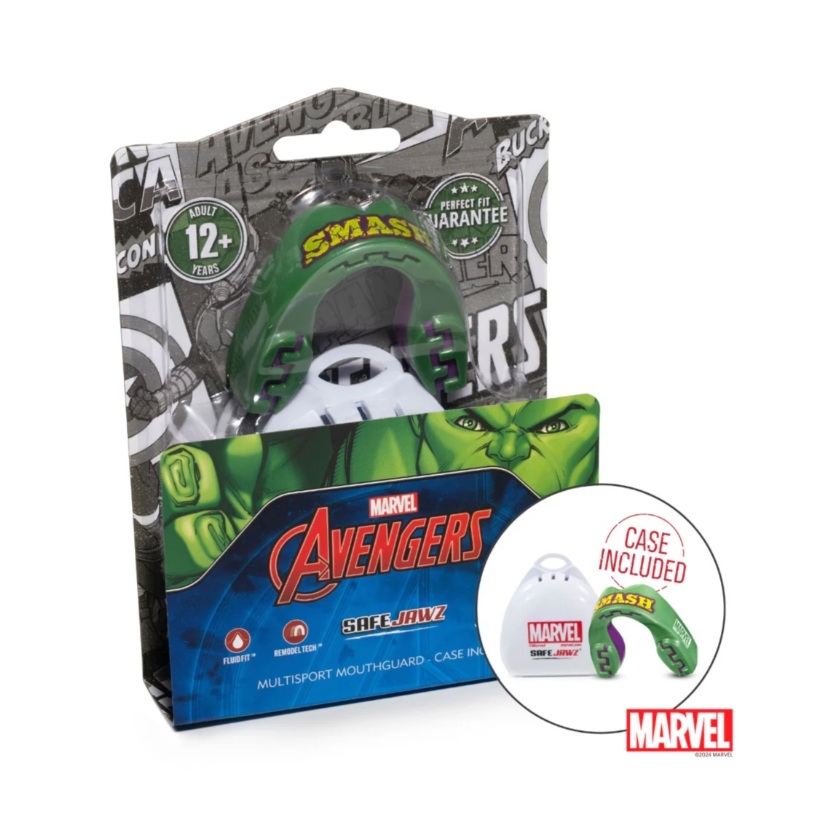 Safejawzi Marveli kollektsioonist leiate laia valiku silmatorkavaid suukaitsmeid, millest igaüks on inspireeritud sellistest ikoonilistest kangelastest nagu Iron Man, Captain America, Black Panther, Hulk, Captain Marvel, Spider Man, Venom, Spider Gwen ja eksimatust Marveli logost. Selle suukaitsme Fluid-Fit tehnoloogia tagab, et kaitsja moodustub ideaalselt teie hammaste ümber, nii et see püsib treeningu ajal ideaalselt paigal. Tänu Jaw-Secure tehnoloogiale on isegi teie alumised hambad kaitstud, hoolimata sellest, et tegemist on ühe suukaitsega. Lisaks saab suukaitse suurust mitu korda muuta, kui sobivus ei ole täiesti rahuldav. Nautige Safejawzi Marveli kollektsiooniga ülimat kaitset ja stiili! - Juunior: kuni 11 aastat Safejawz Marveli suukaitse eelised - inspireeritud ikoonilistest Marveli kangelastest; - Vedeliku sobivus täiuslikuks sobivuseks; - Jaw Secure optimaalseks kaitseks; - Remodel Tech – teie kaitsme kuni 3-kordne ümberkujundamine.