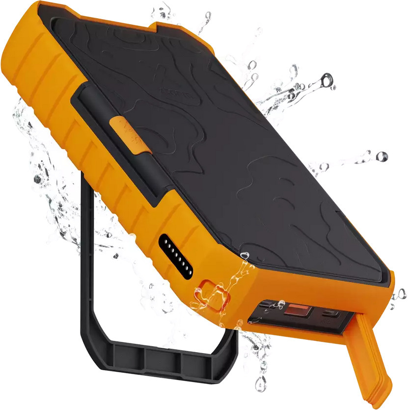 This power bank is designed for active outdoor activities. Its IP65 rating ensures it can withstand dust and water, and its shock-resistant design protects it from bumps and scratches. The foldable solar panel, which delivers 5W of power, allows you to charge the battery in sunshine, making it perfect for camping or cycling. A kickstand or other stand allows you to position the power bank at the right angle to maximise the sun's rays.