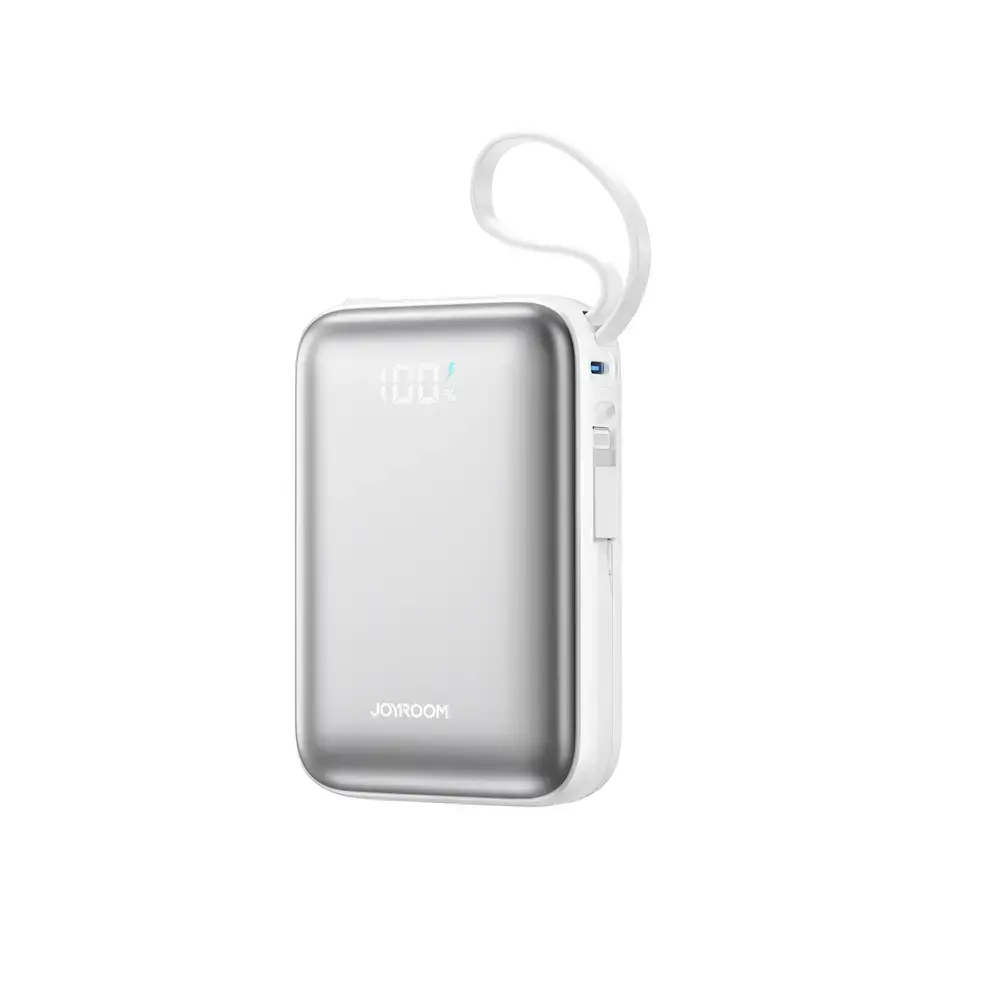 Joyroom JR-PBF29 20000 mAh 22.5W Powerbank with Double Cable - White The Joyroom JR-PBF29 is a high-capacity 20,000 mAh power bank with fast charging up to 22.5W and two built-in cables. Its compact design houses a large battery that allows you to charge your smartphone multiple times without access to a power outlet. The USB-C port supports both input and output, and the digital display shows the power level in real time. This is a practical solution for users of USB-C and Lightning devices. ~ Specification: Brand: Joyroom Model: Joyroom JR-PBF29 Battery capacity: Li-Polymer 20000 mAh 3.85 V (77 Wh) Rated capacity: 12000 mAh (5V = 2.4A) Maximum output power: 22.5 W Housing material: ABS + fireproof PC Net weight: 341.8 g Dimensions: 72.9 x 32.5 x 109 mm Entry: USB-C: 5V = 3A; 9V = 2A; 12V = 1.5A Built-in USB-C cable: 5V=3A; 9V=2A; 12V=1.5A Exit: USB-C: 5V = 2.4A; 9V = 2.22A; 10V = 2.25A; 12V = 1.67A Built-in USB-C cable: 5V=2.4A; 9V=2.22A; 10V=2.25A; 12V=1.67A Built-in Lightning cable: 5V = 2.4A; 9V = 2.22A Multiport output: 5V = 2.4A (max) Color: white ~ Fast charging up to 22.5W A maximum output of 22.5W allows for efficient charging of smartphones and other mobile devices. The power bank automatically adjusts charging parameters, ensuring efficiency and stability. 20000 mAh capacity for long time A large 20,000 mAh battery allows you to charge your phone multiple times, which is useful when traveling, at work, or in situations without access to power. This provides a real reserve of energy for several days of use. Two built-in cables - USB-C and Lightning The integrated USB-C and Lightning cables allow you to charge various devices without the need for additional cables. This is a convenient solution for both Android and Apple users. Charging three devices simultaneously The USB-C port and two built-in cables allow you to power up to three devices simultaneously. This is a practical solution for travel and a busy day out. Digital display and temperature control The digital display shows the charge level and charging status in real time. A temperature control system ensures safe and stable operation by limiting device heat buildup.