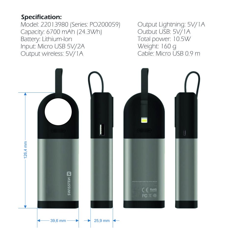 Toitepank Swissten koos sisseehitatud MFi välgukaabli, Apple Watchi juhtmevaba laadimismooduli ja USB-väljundiga. Akupanga koguvõimsus 6700 mAh. Pakendatud Swissteni jaemüügipakendisse.