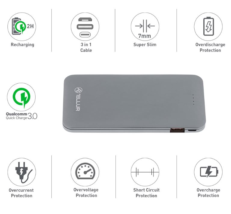 A metallic power bank, crafted with attention for every little detail, as durable as it is slim, with a stylish, eye-catching design. This power bank has Qualcomm Quick Charge 3.0 technology, bening capable of charging 80% of your battery in just 35 minutes. Capacity : 5000mAh Battery : Li-polymer battery Output technology : Wired Output ports : 1 x USB QC 3.0 Output voltage / current : QC 3.0: 4.6 - 6V/3A, 6 - 9V/2A, 9 - 12V/1.5A Input port : Micro-USB Input voltage / current : QC3.0: 3.6 - 6V / 3A; 6 - 9V / 2A; 9 - 12V / 1.5A 18W max (Qualcomm certified) Features : QC 3.0 certified, battery level LED indicator, beatiful metallic slim design Safety : Overcharge, overdischarge, overvoltage, overcurrent, short circuit Charging time : ~2 h Charging cycles : >500 Dimensions : 132 x 68 x 7mm Weight : 130g Compatible with : Almost any smart devices like iPhone, iPad, Android smartphones and other 5V devices via USB Color : Grey Package includes 1 x QC 3.0 5000mAh Metallic Slim Power Bank 1 x 3 in 1 Micro-USB quick input cable with Lightning and Type-C adapters (30cm) 1 x Manual