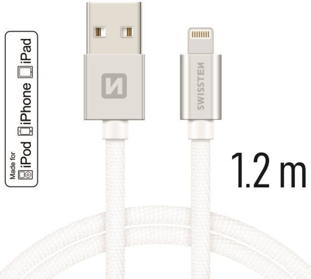 Kvaliteetne tekstiilist andmekaabel USB / Lightning MFi (litsents MFi) pikkusega 1,2 m. Kaabel on tugevdatud suurema voolu (kuni 3A) edastamiseks ja suudab toime tulla kiire 480 Mb/s andmeedastusega. Pakendatud Swissteni jaemüügipakendisse.