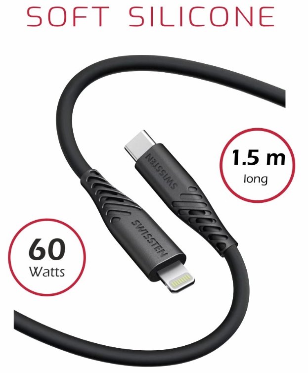 Tired of tangled hard cables that keep cracking? You found it right! The SWISSTEN SOFT SILICONE Data Cable is the perfect companion for recharging and data transfer. This ultra-soft silicone cable is designed to withstand the rigors of everyday use without tangling, fraying or damaging your device. Enjoy seamless connectivity. High powerThe SWISSTEN SOFT SILICONE cable can be charged with a maximum current of 3A and can also be used for fast charging technology with a power of up to 60W. Soft siliconeThe SWISSTEN SOFT SILICONE cable is made of soft silicone. This makes it flexible under all conditions and has a high resistance to bending. The cable is very soft and pleasant to the touch, so all work with it will be pleasant for you. Advantages of cableFlexible and silicone cable construction.It supports Apple Carplay and Android Auto.Easy handling thanks to the length of 1.5 m.Data transfer at a speed of 480 Mb/s.