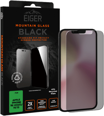 The Eiger Mountain Black Privacy Screen Protector protects your iPhone from scratches and bumps. Thanks to the integrated 2-way privacy filter, your screen content remains protected from prying eyes. The high-quality, hardened aluminosilicate glass is twice as strong as conventional glass and offers high scratch resistance. An oleophobic coating reduces fingerprints and ensures a clear view. The custom-fit shape enables use with most protective cases.Features Two-way privacy filter: Protects your data from side viewsHigh scratch resistance: Resistant to scratches and bumpsOleophobic coating: Reduces fingerprints for a clear viewCase-Friendly Design: Compatible with most protective casesEasy installation: Bubble-free application thanks to precise fitTechnical data Manufacturer Eiger Compatibility Apple iPhone SE (2025)/ 14/ 13 Product type Screen protector for smartphones Product colour transparent