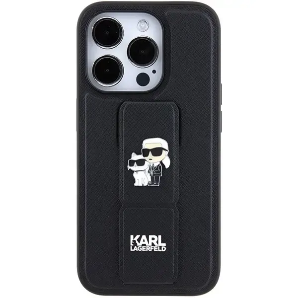 Karl Lagerfeld Gripstand Saffiano nahast Karl&Choupette iPhone 15 Pro ümbris - must (KF001889-0)