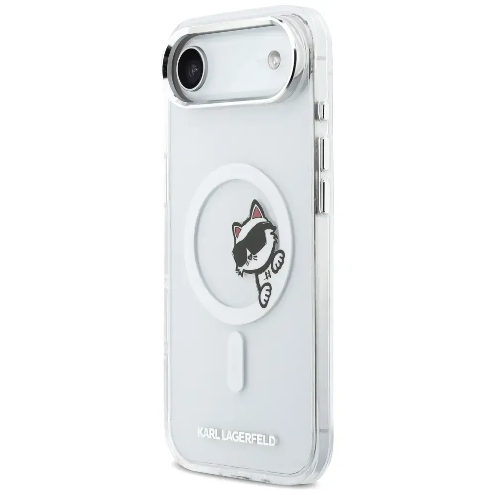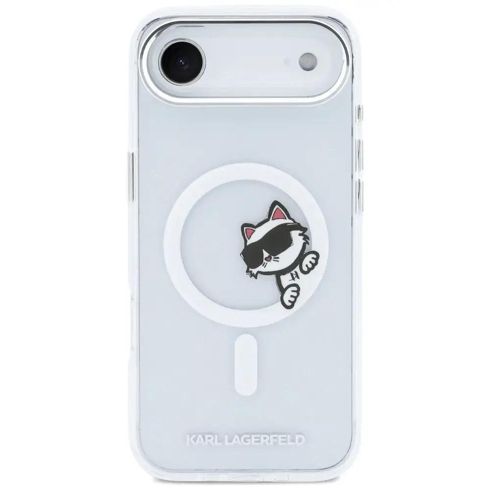 Elevate your iPhone 17 Air with the Karl Lagerfeld IML Peekaboo case, a fusion of high fashion and robust protection. Crafted from durable PC and TPU, this transparent case features an iconic Choupette design peeking from behind the MagSafe ring, accented with sophisticated aluminum details on the camera frame and buttons. Its precise fit ensures seamless access to all functions while offering superior defense against drops and scratches, with raised edges safeguarding both the screen and camera lenses. Experience effortless wireless charging with integrated MagSafe compatibility.